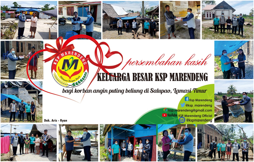 Penyerahan bantuan diserahkan langsung oleh Kepala Cabang KSP Marendeng Cab. Palopo, Bpk. Nicodemus Kala Lembang yang didampingi oleh Tim Inti wilayah Salupao dan Staf Cabang Palopo.